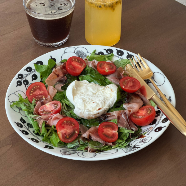 「今日は上手に焼けたよ!」と夫の声。わたしのホットケーキ好きがうつったのか、休日の朝食はよく夫がホットケーキを焼いてくれます。柄もので一見華やかですが、モノトーンなので食材を邪魔しません。朝昼夜と一番活躍しているプレートです。