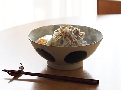 このどんぶり、ホントに軽いんです。我が家はイッタラやアラビアの器が多いので、はじめて持った時は衝撃を受けました。柄違いで家族分揃えていて、この丸文は子供のお気に入り。うどんもラーメンもお蕎麦にも合うデザインです。
