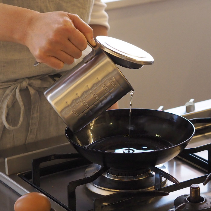 少量の油で揚げ物や揚げ焼きをする方、油慣らしをした後の油を戻すとき、勢いよく油を出し過ぎちゃったときは小さい300ml。よく揚げ物をされる方なら大きい700mlがおすすめです。オイルポットとして使わないときは計量カップとしてもお使いいただけます。