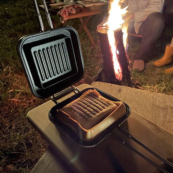 GWにスウェーデントーチという切り込みを入れた丸太に直接火をつける焚き火で夕飯を楽しみました。串に刺したソーセージやお肉、マシュマロなどを自分好みに炙って育てる焚火料理は、準備も簡単で楽しめるのでお勧めです。ただ主食をどうするかでいつも悩んでいて、今までは塩むすびを作っておいたのですが、最近店長みさこに勧められて購入したホットパンを試したところ、いい具合に調理できました。よくあるホットサンドメーカーも持っていますが、ホットパンは具材がたっぷり入るし、じんわり火が入るので焦げ付いて失敗したーっていう事がありません。カリッと焼けて本当に美味しいんですよ。手を汚さずに食べられるので、ホットサンドはキャンプに持ってこいの主食です。