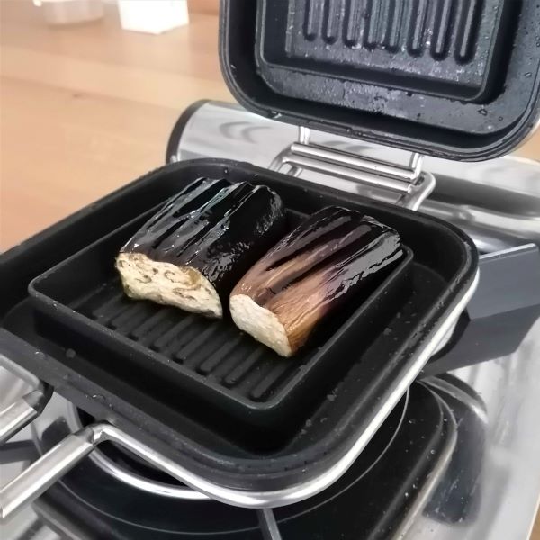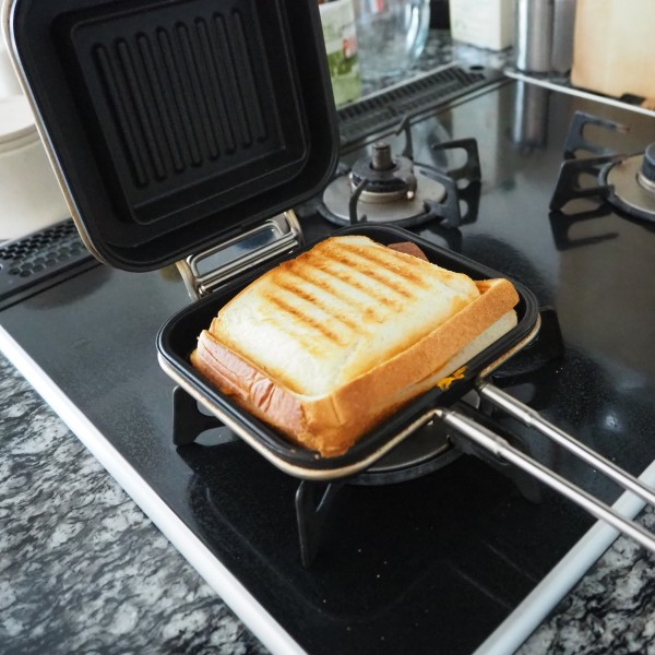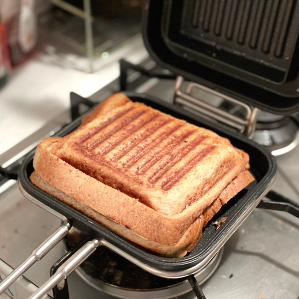 パン皿を個々にグリルパンとして使うことも可能で、目玉焼きやウインナーを焼いたり、トーストを焼いたりちょっとした温めもOK。しかも、取り外しができることで具材をのせるときに安定感が生まれ、流しのスペースが狭くても洗いやすく快適です。キャンプなどのアウトドアでも活躍度高そうです!
