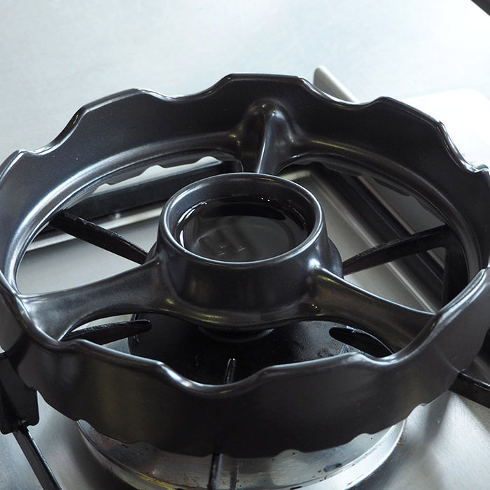 窪み部分の水がなくなるとセンサーが作動するようになっています。長時間調理する場合は水の減り具合を確認し、全ての水がなくなる前に補充してください。材質は耐熱陶器製のため、五徳と同じ感覚で使用すると破損の原因にも。少しだけ優しく扱うと長くご愛用いただけます。