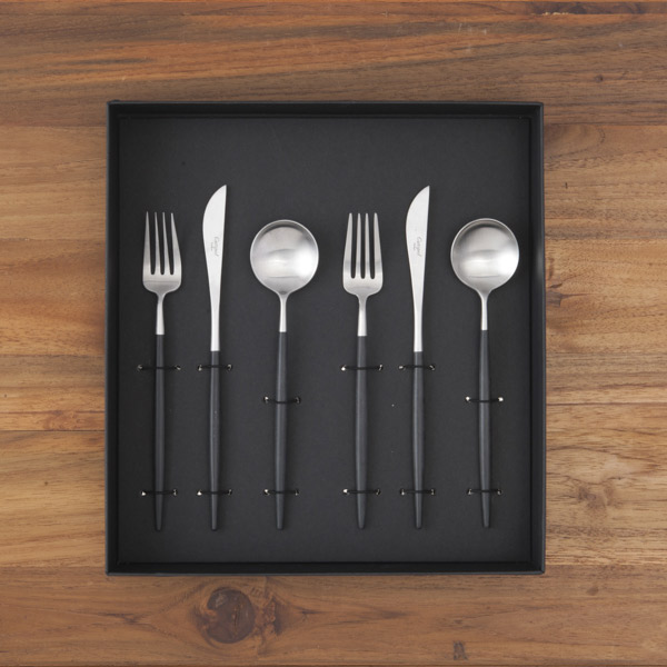 北欧などの洋食器だけではなく繊細な和食器とも相性が良い、合わせる食器を選ばないGOA。ブラック樹脂の柄とマットシルバーの組み合わせは、ミニマムでハイセンスな印象を与えてくれます。オリジナリティーに溢れるラインと手作業ならではの独特なカッティングが施されたGOAは、そのデザイン性だけでなく使い心地にもこだわって作られています。また、ボックス入りのセットはギフトにもどうぞ。