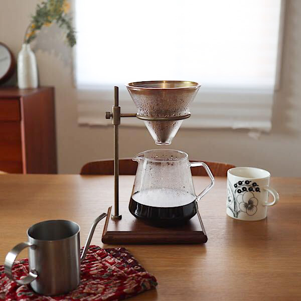 ビンテージ感のある真鍮のスタンド、繊細なガラス、ゴールドのステンレスフィルター、ウォールナットの土台・・・パーツのコンビネーションが美しいブリューワースタンドセット4cupsは、そこにあるだけで周りの雰囲気を一変させてしまう、オブジェのような佇まい。ついついキッチンやダイニングなど目のつくところに置いておきたくなります。