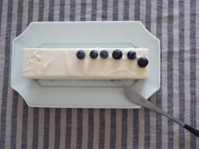 若山曜子さんのレシピ本のスリムケーキ型を使って、レアチーズケーキを作りました。 型は207×57×60mmなので、お皿の余白ギリギリになりますが、パウンドケーキやスクエア型のケーキを乗せるときはいつもこのお皿を使います。お食事を瑞々しく見せてくれるお皿ですが、ケーキもおいしそうに見えます。