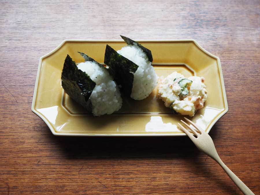 夕ごはんで残ってしまったご飯を適当に結んでおいて、次の日の朝に築地の海苔を巻いて食べました。ゆるゆるに結んだ不格好なおむすびと残り物のお惣菜も、この長皿に盛り付ければ美味しそうに見えます。干物も焼き餃子もより美味しそうに見えるだろうなぁと想像するのも楽しい朝ごはんでした。