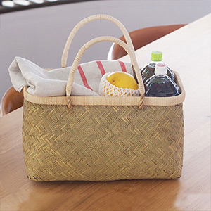 職人の手によってひとつひとつ丁寧に編み上げられている青竹の市場かご。たっぷりとしたマチと耐久性の高さが特徴で重い荷物の持ち運びも安心なように底面を竹で補強したり、手が痛くなりにくく物の出し入れも気持ち良くできるよう持ち手と縁のかがりは滑らかな手触りの籐で巻き上げています。通気性のよいかごは野菜の保存、パンや乾物の収納、絵本を入れておいたり、アウトドアでお使いになる方も多い商品です。使っているうちに壊れてしまった場合はかごやさんで修理を承ってくれるそう。ぜひ、末長くご愛用ください。