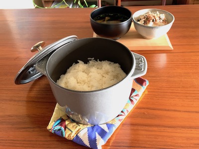 ごはん炊きは鍋派のわたし。これまではクリステルを使っていましたが、前から一度使ってみたかったストウブのごはん鍋を遂にお迎えしました。クリステルに比べると沸騰するまでに時間がかかりますが、炊飯時間は同じでおいしーく炊き上がり、鍋肌にごはん粒が付きづらいからお手入れも簡単。今日は実家便の新米をいただきます♪