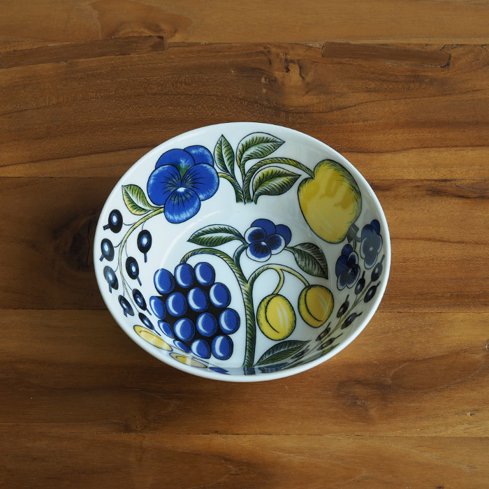 1969年に「フィンランド陶芸界のプリンス」と謳われるビルガー・カイピアイネンのデザインにより製作されました。夏の植物をモチーフにして、青や黄色を多用して描かれた果物と植物のあふれんばかりの力強いエネルギーが、そのままテーブルウェアに落としこまれとても若々しい印象を放ちます。大胆なデザインを独特のタッチで描いています。アイテム毎に少しずつデザインが異なり、豊かな表情を見せてくれるところも魅力的です。何を盛りつけても食材や料理の色を引き立て、テーブルを見事に調和します。まずはメインのプレートから、そして次はマグカップとお気に入りを一つずつ増やしてあなただけの楽園(パラティッシ)をお楽しみください。
