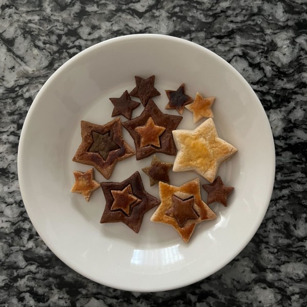 抜き型はキャラ弁をつくれない自分にとってお弁当を華やかにできる頼もしい道具。星型は男女関係なく使えて重宝しています。ニンジンやチーズで抜いてお弁当にいれるだけでなく、クッキーを作るときにも使えるんです。先日お菓子のいえを作った時クッキー生地が余り、クッキー型がない我が家は星の抜き型で抜いてみました。こどもたちがサイズ違いの星の抜型も使って入れ子模様にしてみたり、楽しそうに作業していました。