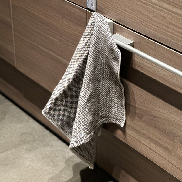 どのようなキッチンとも仲良くできるニュートラルなグレーをベースに、色見本とにらめっこしながらセレクトしたのがダークグレーとライトグレー。同色で統一してもスタイリッシュですが、2枚並べてストックしたときにも違和感のない色味のトーンになっています。立体感のあるジャガード織りは上品な柄を楽しめるだけでなく、しっかりとした耐久性と毛羽落ちを防ぐ効果も。使いはじめから心地よい柔らかさがあり、グラスの底やお皿の高台周りにも気持ちよくフィットしてくれます。