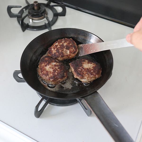 以前、お客様から、このあんベラがフライ返しにも使えるというお声をいただいたので、早速試してみました。お弁当に入れる小さめのハンバーグも一つずつひっくり返せます!普通のフライ返しだと、隣のハンバーグにあたってボロボロになってしまうこともあったけど、これならきれいに全部返せました。しかも、継ぎ目部分がないのですぐに洗えます。教えてくださった方に感謝です!!