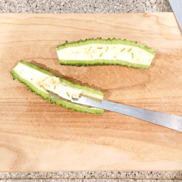 実家からもらってきた小さ目のゴーヤ。いつもはスプーンで種をくり抜くのですが、かなり細目だったので目についたあんベラの小さいほうを使ってみたらピッタリ!わたの部分も綺麗に取り除けました。