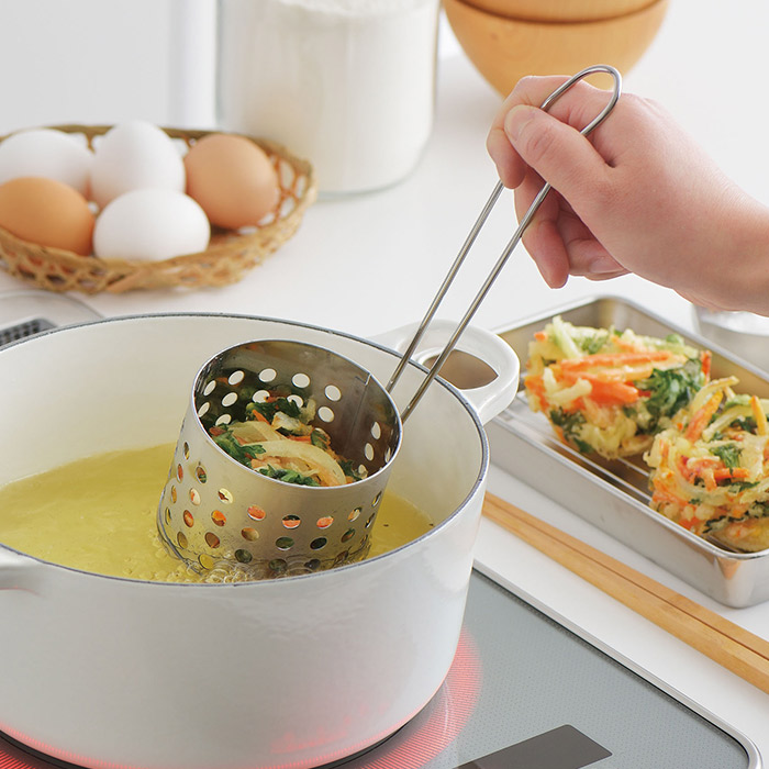 タネの量が少な目でもきれいな形にまとまり、お好みに合わせて厚みの調整が可能です。家庭用の天ぷら鍋で2~3個のかき揚げが作れるサイズですので、ご家族の人数分用意しておくと、揚げたてのかき揚げを添えた蕎麦やうどんが召し上がれますよ。