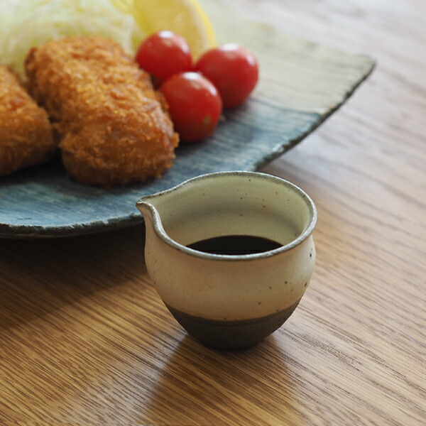粉引きの白化粧と土の色そのままのツートンカラーが可愛らしいミルクピッチャーです。ほっこりとした温かみのあるミルクピッチャーは手作りのドレッシングやソースを入れてテーブルにちょこんと置いたり、ヨーグルトにかけるフルーツソースを入れても。縁まわりの窪みに指がしっかりと収まるので、使いやすさも◎です。
