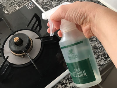 夕食の片付け後に必ずコンロ周りの油汚れをふいてキッチンリセットをするようにしてます。グリーンモーションのエコキッチンクリーナーは油汚れがよく落ちる!シュッとしてささっとふくだけできれいになります。ヒノキの香りが好きなので、香りもGOOD。月に一度レンジフードの掃除もこれでしてます。