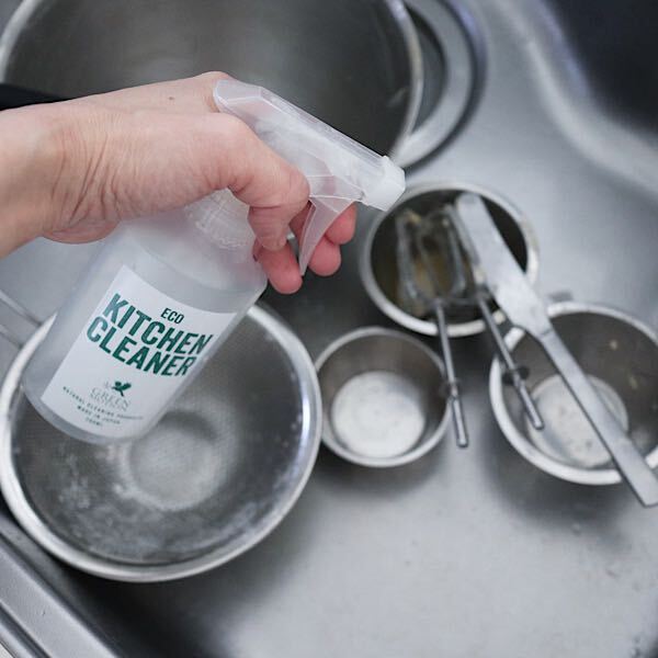 洗い物をする前にこのスプレーをシュッシュっと吹きかけておくと洗い物が断然楽になります。例えばケーキ作りで使ったボウルや泡だて器やゴムベラなどバターがついてぬるぬるしている状態でも、事前にスプレーをしておくと水や洗剤もたくさん使わず、さらに洗い物の時間も短縮できます。他にも揚げ物のあとの油汚れも落ちやすいし、卵を溶いたボウルなどこのスプレーをして洗い直すと卵臭さもすっきり落ちますよ。一度使うと手放せなくなるキッチンクリーナーです!