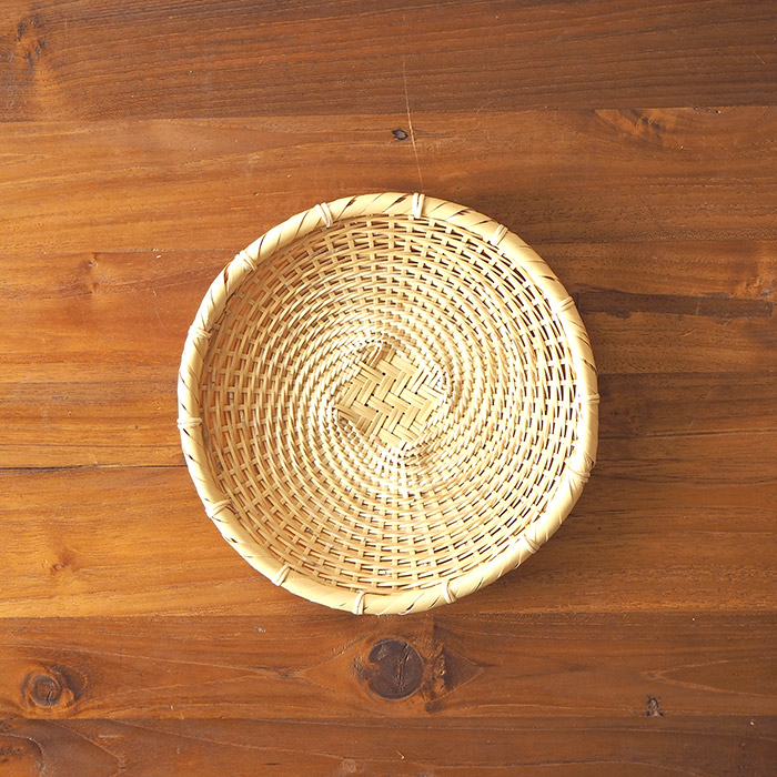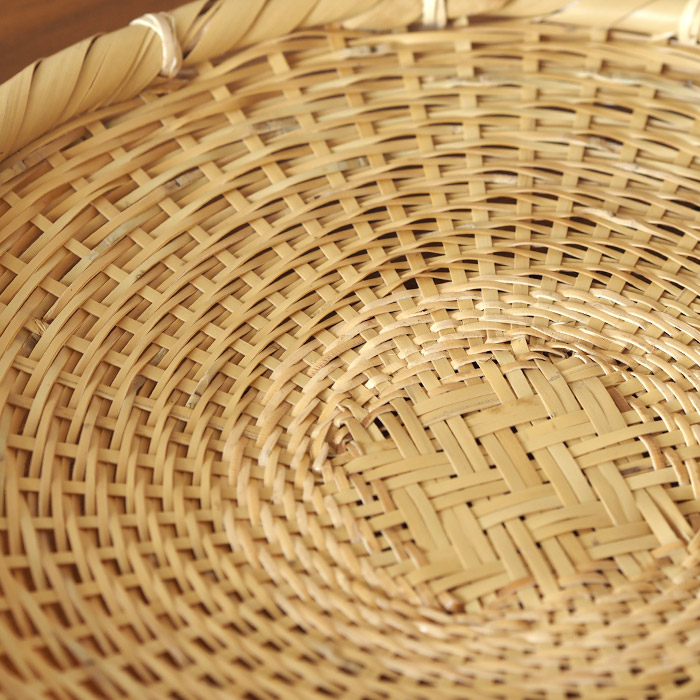 凛としたひごを用いて細かく丁寧に、そして美しく編み上げた公長斎小菅のそばざる。素朴ながら竹のしなやかさと強さを感じる意匠を凝らしたざるで、中央部分は渦巻き模様のように編み込まれ、太めの竹でぐるりと囲んだ縁取りには機能性はもとより、デザインのアクセントにもなる籐のかがりが施されています。