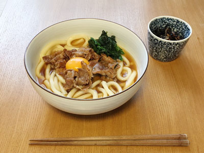 ひとりでさっと食べるお昼には麺ものをよく作ります。うどんやラーメンなどにぴったりなのがこの浅めん丼。深めん丼よりも面が広いので具をたくさん盛り付けても大丈夫です。今日はがっつり肉うどんに常備菜のひじきの煮物でランチです。