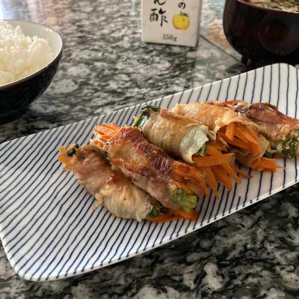 白山陶器の長焼皿といったらお魚とかおにぎりなど和食をのせるイメージですが、実は和洋中どんなお料理にもあうオールマイティなお皿なんです。洋皿でいうとオーバル皿に似た使い心地といったところでしょうか。今日は野菜の肉巻き。にんじんがはみだして不格好な肉巻きですがお腹に入ればいっしょと思って作っているいつもの状態でお届けしております(汗)。暑い時期にはこれにぽん酢をかけるとさっぱりとしておいしさが増します。細長い形が食卓の場所をとらず、収納の面でも優秀です。