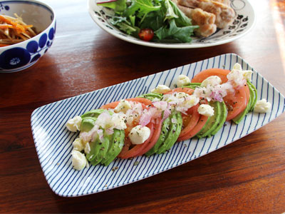 いつもは焼き魚に使っている長焼皿にアボカド、トマトのカプレーゼを盛りつけました。ストライプの柄が洋食器とも合わせやすく、ちょっとした前菜を盛りつけるのにちょうどいい大きさです。