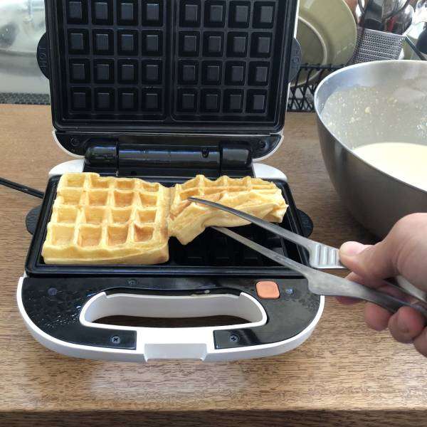 甘いものが食べたいなーという時、家にある材料でチャチャッと作れるワッフルは休日のおやつの定番です。焼きたてを取る時にたまたま側にあったクレバートングを使ってみたところ、トング先がすっとワッフル下に入り込み、焼き型も傷つけず、ワッフルもつぶさずに取りあげることができました。それからはワッフル作りには欠かせない道具の一つです。クレバートング、名前の通り賢いトングです。