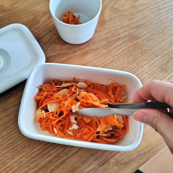 プロキッチンスタッフのほとんどが持っているといっても過言ではないコンテのトング。重量も使い心地も、とにかく軽いんです。菜箸がわりに使えるように、まずおてがる料理トング175を購入したのですが今度は食卓で使うように薬味トング150を導入しました。ザーサイや福神漬けなど瓶の中の食材を取り出したり、取り分け箸のかわりとして使ったり大活躍。スモークサーモンや生ハムをはがしたり、お弁当のおかずを詰める時など自分の手でつかんでいるような感覚で使えます。
