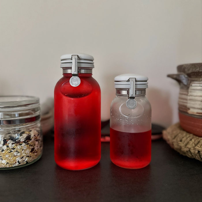自家製の昆布しょうゆ、にんにくしょうゆ、麺つゆなどを常備するときに重宝する調味料びんです。出番の多い調味料を手作りしておけば、わが家の味を手軽に作れるだけでなく添加物などを気にせず安心して使うことができます。シリコン製の注ぎ口は液ダレしにくく取り外すことができるので、昆布などの固形の材料を出し入れするのに便利。油を含んだ調味料に使ってもパーツは全て分解して洗え、いつも清潔さを保つことができます。また、密閉性の高い蓋はにおい漏れの心配がなく、ドレッシングの材料を入れて振り混ぜることもOK。たくさんつくった梅酒や果実酒、大容量サイズの調味料を小分けにするときにも重宝します。