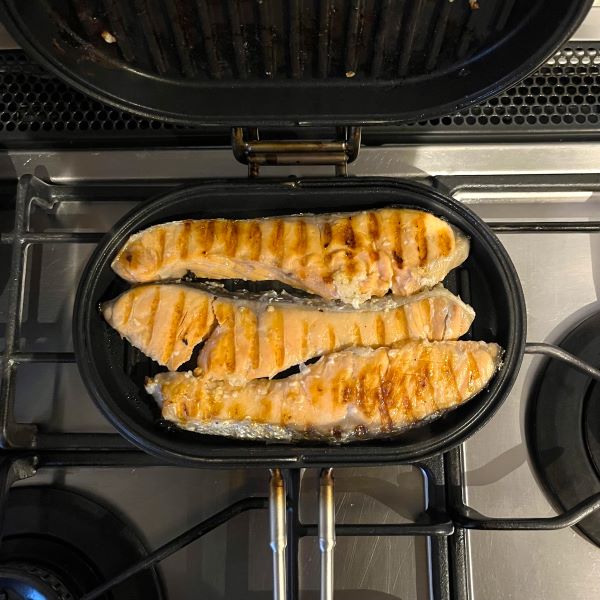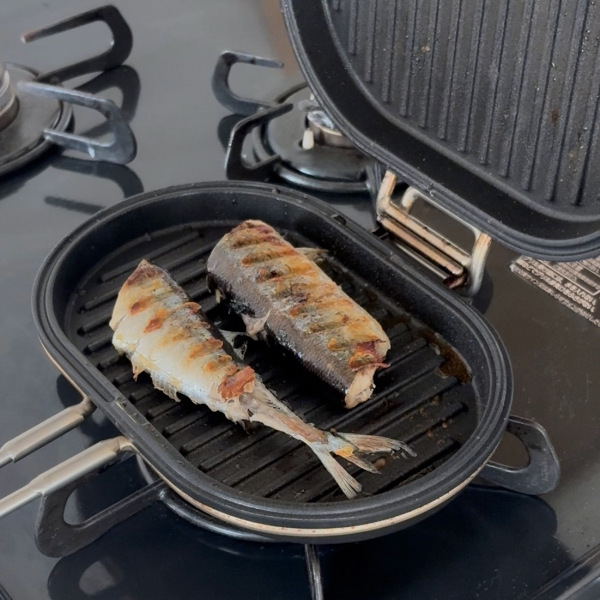 朝食に鯵の開きを焼こうと思って家事問屋パニーニパンに入れてみたところ、しっぽを無理やり曲げたらぴったり納まってなんとも朝から気分が良い!蓋を閉じて中弱火で焼いている間にお味噌汁や玉子焼きを作って、香ばしい香りがしてきたらひっくり返して2~3分焼けば出来上がり!煙の出も最小限だから火災報知機の心配もしなくていいし、何よりお手入れが簡単。しかもコンパクトで隙間にも収まり、フックに吊るして収納できるので取り出しやすく、気づけば毎日のように手が伸びています。