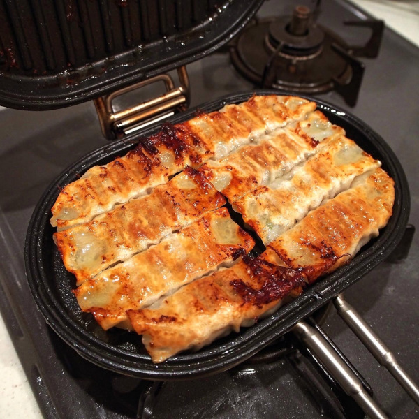 パニーニパンで焼けるのはパンだけじゃない!というところをアピールしたくて以前パニーニパンレシピコンテストを開催した際に優勝した野沢菜餃子を焼いた時の写真です。端っこの餃子は少し変形しちゃうけど、8個一度に焼くことが出来ますよ。通常の餃子ももちろん焼けます。しっかり蒸し焼きできるし、板厚もあるので蓋を開けた後に水分を飛ばしながらカリッと香ばしく焼き目をつけることもできちゃう万能選手です。