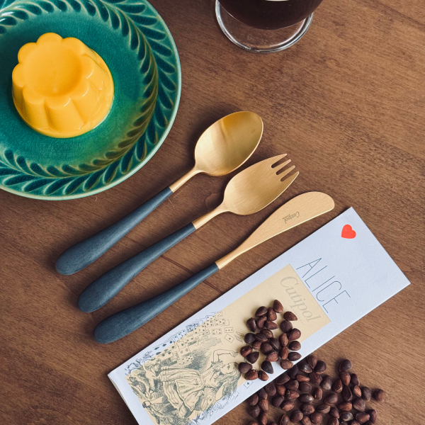 「不思議の国のアリス」に登場する食卓の世界観をカトラリーに落としこんだ子ども用カトラリーセット「アリス(ALICE)」。デザインはクチポールのデザイナー、ジョアキム・リベイロによるもので、握りやすい曲線や左右非対称のハンドルなど、テーブルマナーを学びはじめた子どもたちへ向けて作られました。また、「アリス」はもう一人のアリスに捧げられたカトラリーでもあります。夫のジュゼ・リベイロとともに1964年、クチポールを創業したアリス・マルケスへの愛情と尊敬をこめて、このカトラリーは「アリス」と名付けられました。