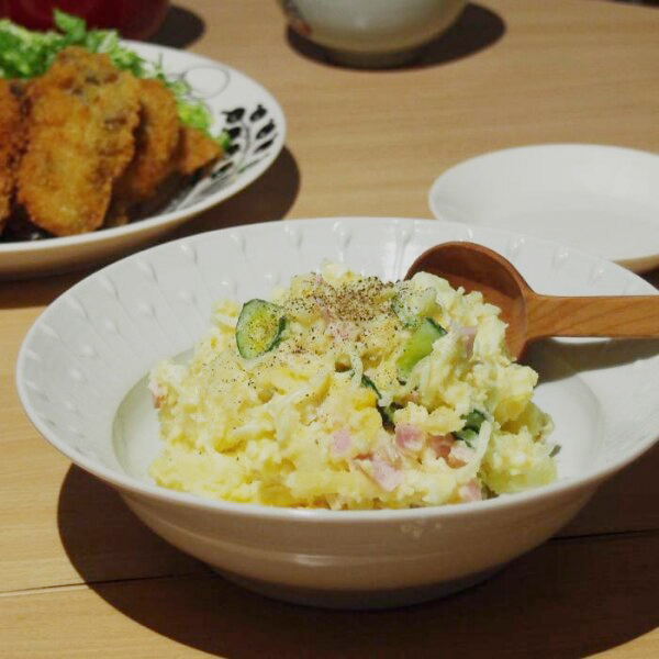 白磁のシンプルな器なのですが、眺めているとその魅力がじわじわと私の心を奪っていく…、そんな高原さんのいっちん雫シリーズ。初めて手にした時「暮しの手帖」のポテサラレシピページが頭に浮かびました。早速わが家のポテサラを盛り付けて実現。想像した通りポテサラとよく合う!中鉢としても優秀な器です。