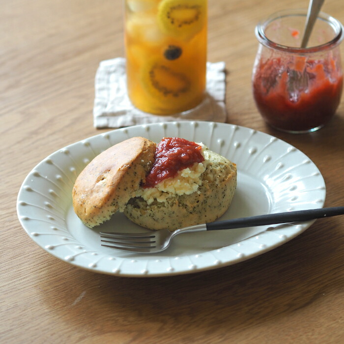 幅広のリムに施された雫の模様とゆるやかなラインが魅力的な楕円皿。テーブルに置いた瞬間から目を引く存在感があります。午後のティータイムにはスコーンとクロテッドクリームをのせたり、ディナータイムには前菜2種の盛り合わせ、おつまみのチーズやナッツを盛りつけても素敵。余白を楽しみながら盛りつけをしてみてください。