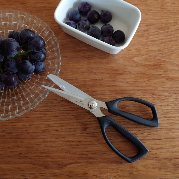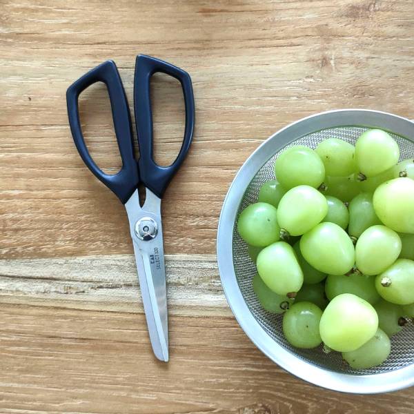 このはさみをお迎えしてから、包丁でお肉を切っていないような。豚の脂身も鶏肉の皮もパツパツと気持ち良く切れます。持ち手に安心感があり力も入れやすいです。使うたび、こんなに便利なものがあるなんてと感動です。季節外れな写真ですが、実家から送ってもらった大量のシャインマスカットを冷凍するため、房からパチンパチンと切り離したところ。硬い軸も問題なく切れます。左右差がないから左利きの人も使いやすいと思います。
