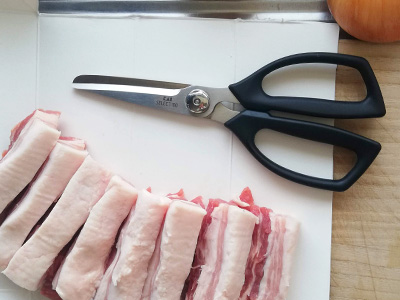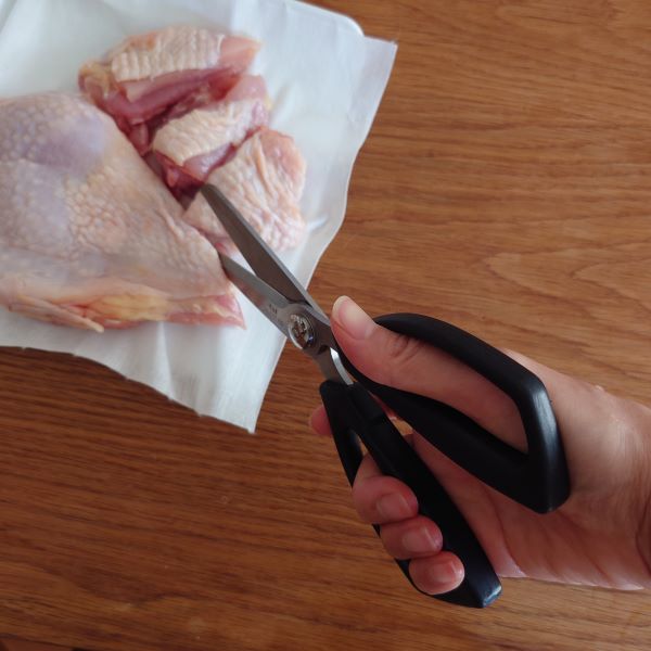 袋や葉物野菜を切るくらいしか活用していなかったキッチンばさみ。はさみでお肉を切る、という行為になんだか抵抗があったんですが、ある時ふと思いついて鶏肉の下処理に使ってみたところ、目からウロコが!包丁だと鶏肉は皮目がカットしづらいと感じていたのですが、はさみなら全然気にならない。包丁を使うよりも早くできる(自分比)。細かい脂の取り除きははさみでは難しいかなと思いきや、先端の精度が高く(さすが貝印)包丁よりも細かく取り除くができました。なんで早くやらなかったの~、と後悔しきりです。