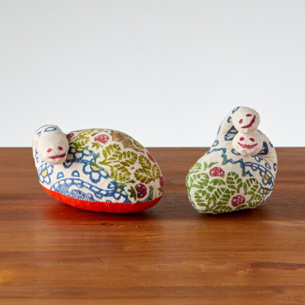飛騨高山の工房で作られている、素朴な味わいが魅力の木版手染めぬいぐるみ。こちらは十二支シリーズの巳(へび)の親子セットになります。
