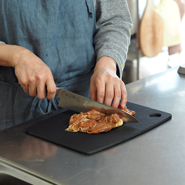 実際に触ってみると少しざらつきがあり、かなり硬質な印象。切った感じは木のまな板と比べると包丁がボードにあたったときにカンカンと音がし、やや硬さを感じます。包丁の刃に優しい素材ですが、使い慣れるまでは刃当たりが気になる方もいらっしゃるかもしれません。