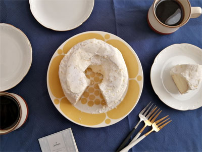 主人が子供の頃からよく食べていたというユーハイムのフランクフルタークランツ(フランクフルト市の王冠)という純白のお菓子。バタークリームが美味しくて素朴なケーキ。淡い黄色のお花柄にぴったりです。レトロっぽさがめちゃくちゃかわいいシリーズです♪