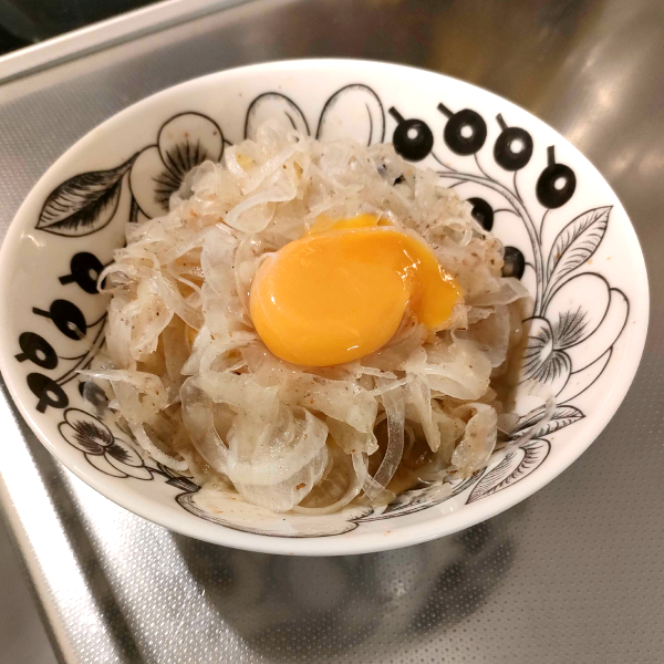 卵黄を落とすのに失敗しましたが、我が家のオニスラです。茅乃舎の出汁を振りかけ、ポン酢かお醤油です。いらないかな?と思っていたスライサーですが、本当にあっという間で驚きました。包丁の1/4ほどの時間で完成。今回は薄めにスライスしました。透けてるの、わかりますか?厚み調整でこれくらい薄くできます。便利!