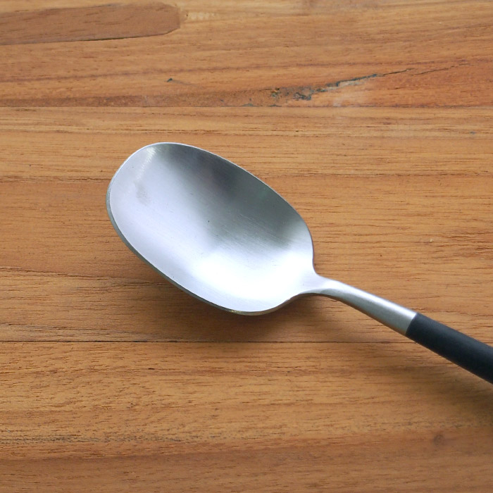 テーブルスプーンよりもふた回り程小さめサイズ。テーブルスプーンだとちょっと大きい・・・という女性の方やお子さまのメインスプーンとして使っても良さそうです。口に入れやすい細長い形状にこだわって作られ、やや角ばったフォルムは食材を切り分けながら食べるときに使いやすさを実感していただけます。スプーンの深さも絶妙で口から抜くときもスムーズで滑らか。デザートをより美味しく感じられそうです。