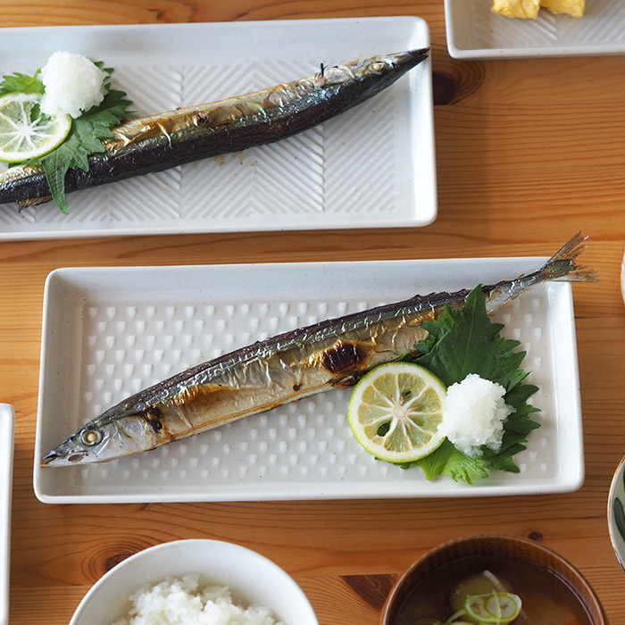 つやのある陶肌にざっくりとした網目が浮かび上がるヘリンボーン柄。陶器のもつ質感に加え、布の風合いを出すためにあえて焼き上がりの色むらや生地を貼り合わせたような重なり、歪みなどを活かしたデザインになっています。全て職人による手仕事から生まれていますので、その味わいも作品のひとつを捉え、個性を楽しみながら愛着を持ってお使いください。