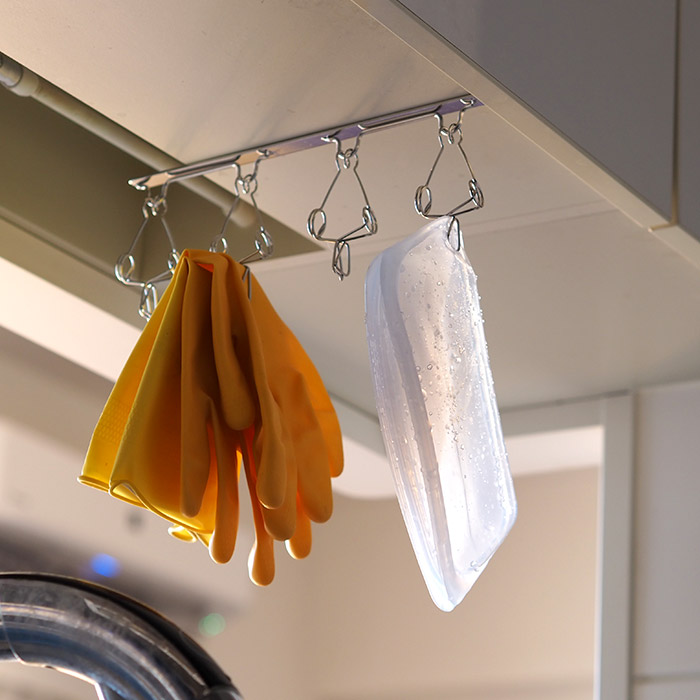 吊戸棚ピンチを棚板1〜2cmの吊戸棚に差し込むだけで、洗ったふきんやジッパーバッグ、ゴム手袋などの干し場所を作ることができます。てこの原理を使用し軽い力で大きく開くピンチフックは4列並んでおり、適度なスペースを設けているため濡れたもの同士が触れてしまう心配もございません。ユニークなキッチンフックのデザインと目立ちにくく空間の雰囲気を損ねないシンプルなデザインが取り入れやすいポイント。便利アイテムながらデザイン性にもこだわった家事問屋らしいアイテムです。