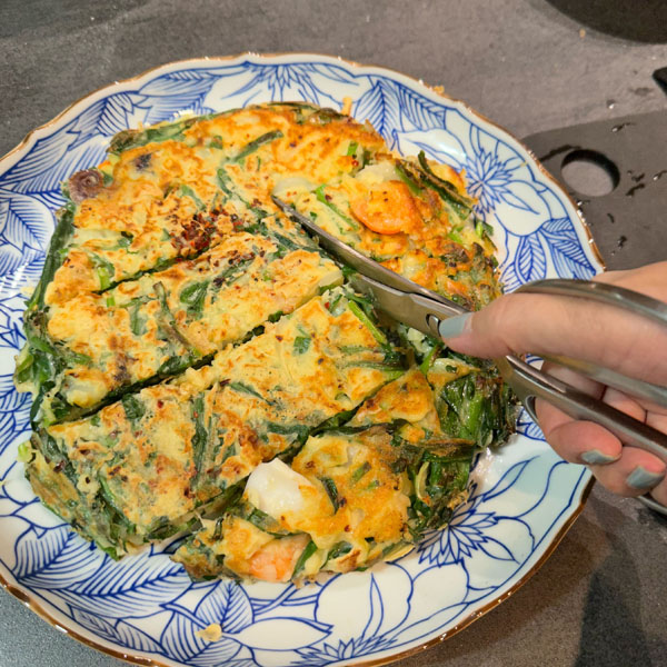 貝印の「鍛造オールステンレスカーブキッチン鋏」の特徴的なカーブ刃は、お皿やまな板など平らなところに置いた料理をカットすることが得意です。今日は「海鮮チヂミ」をカットしてみました。刃にギザギザがついているので、ツルッと逃げそうなニラもしっかり切れます。碁盤の目のようにカットするとなんだかお店に来たような気持ちになりワクワク。チヂミの甘辛なタレも用意して、盛り上がって参りました(ビール!)