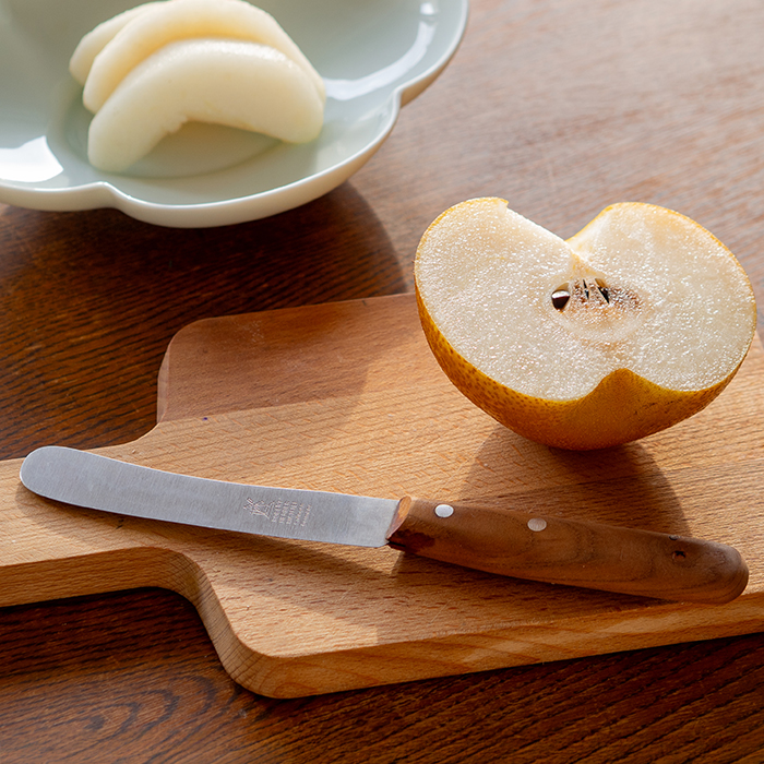 先が丸いロベルト・ヘアダーのオールドジャーマンナイフ。一見、果物を切るのには向かないのかなと思うかもしれませんが、そんなことはありません。果物程度の硬さなら問題なくスパッと切れます。りんごや梨のように種を取る作業もお手のもの。ハンドルの滑らかな手触りも心地よく、このナイフならではの上質さを感じます。テーブルでおしゃべりをしながら、「ちょっと果物でも剥こうか」なんてときにぴったり。おしゃれで使いやすい、ワンランク上のテーブルナイフです。