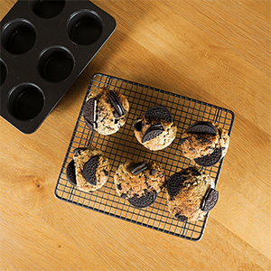 パウンドケーキや直径20cmくらいのスポンジケーキにちょうど良いサイズで、マフィンやマドレーヌ、小さなクッキーなどの焼き菓子を置いても落ちない細かい網目がポイント。さらにクッキーにアイシングをしたり、チョコ掛けのドーナツを作るときなどにも重宝します。普段使いならトーストしたパンをのせて朝食シーンに登場させてもおしゃれですよ。アンティークのような黒色のケーキクーラーはインテリア小物としても十分な存在感。使わないときはフックにかけて見せる収納を楽しんでみてください。