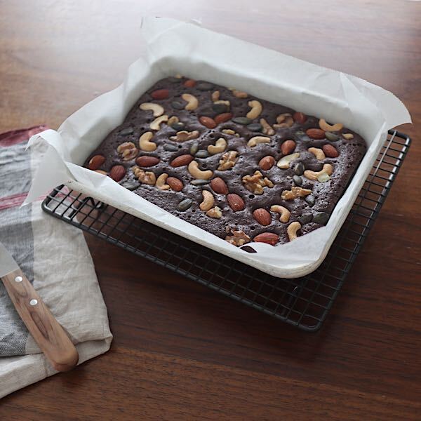バレンタインが近いのでチョコレートブラウニーを焼きました。型は「野田琺瑯バット全白21取」を使ったらこのケーキクーラーにぴったり。チョコレートのお菓子はチョコとバターを湯煎で溶かすので冬でも作りやすいんです。バット型で焼くと焼き時間も短いしブラウニーは混ぜて焼くだけで簡単にできちゃいます。お菓子作りにケーキクーラーは必需品。焼きたてのお菓子を冷ますのにこのケーキクーラーなら食卓に置いたままでもおしゃれですよ。
