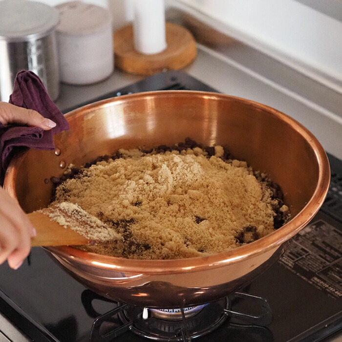 32cmは本格的なお菓子作りをされる方や一度にたくさん仕込みたい方におすすめのサイズです。撮影の際は小豆750gくらいを使用してあんこを炊きましたが、鍋底から小豆をかき混ぜる作業もしやすくちょうど良い分量でした。他にもジャムやコンフィチュール、チョコレートソースなどにもどうぞ。家庭用のガスコンロで使用する際は五徳の上に底の丸みがはまらなかったり、中央にある「温度センサー」によって鍋が安定しない場合があります。片側のリング(取っ手)を支えにして少し斜めに傾けると作業がしやすくなります。その際は厚手のミトンや布巾などを使って鍋をしっかりと支えながら作業してください。付属のリングでフックなどに引っ掛けておけるため、銅鍋をおしゃれに見せて収納することができます。