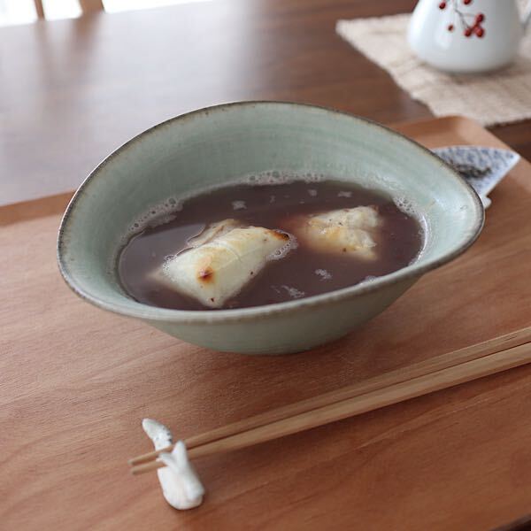 お正月からこの時期はお餅を毎日のように食べていますが、私の一番好きな食べ方はあんこたっぷりのおしるこ!おもちは2個食べたいので普段使っているお椀だと溢れてしまうんですが、この6寸の楕円鉢なら汁物もたっぷり入れられるので余裕でお餅も2個入ります。市野耕さんの新作のこの「彩色灰釉」シリーズは明るめのグリーン色味が渋すぎず、汁物や煮物などをよりおいしく見せてくれるのでお気に入りの釉薬シリーズです。
