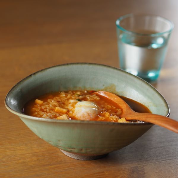 心が躍る、市野耕さんの楕円鉢。独特なかたちと釉薬の表情から、上級者向けの印象を持っていましたが、実際に使ってみるとその印象はガラリ。盛り付けたのは、温泉卵をのせたカルビクッパ。少し濁りのある優しい緑色と、クッパのオレンジが絶妙にマッチして、想像以上に料理が映えます。十分な深さとリムの立ち上がりのおかげで、こんもり美味しそうに盛り付けられるのには感動。しかも電子レンジOKだなんて嬉しすぎ。背伸びせず、でも少し特別な食卓づくりを叶えてくれる器です。