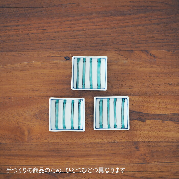 高原真由美さんの作品の多くはシックな佇まいのものが多く、呉須の青色が際立つ、どこか懐かしさを感じさせる器が特徴です。爽やかなストライプ模様を施した色絵縞の豆皿。ラフに描かれた縞模様が愛らしい豆皿は、小さいながらも器使いの楽しさを感じていただけます。